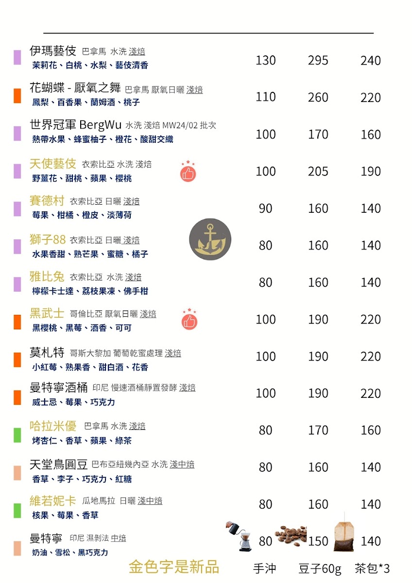 Gold Anchor Coffee specializes exclusively in pour-over methods, ensuring that each cup is brewed to perfection. The menu boasts an impressive selection of meticulously sourced beans, with the standout offerings including the 伊瑪藝伎 巴拿馬 (Panama Geisha) with its delicate flavors of jasmine, white peach, and pear for NT$130.00 and the 獅子88 衣索比亞 (Ethiopian Sidamo), known for its fruity notes like ripe mango and honey, available for NT$80.00. Here, cold-brew coffee is a game-changer – no waiting required! Simply order and savor.